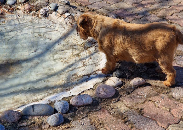 TUESDAY 21.04. Kesän tulolta näyttää uhkaavasti. Paljoa ei oo tarvinnu siivoilla, ihme vähällä selvitty. Kunnon luonnon sade tekis poikaa. Nyt vaan jotain tihkuja ollu. ![]() Koiratarhan tiilet painepesurin käsittelyssä tokan kerran 3 viikkoo sitten. Nyt kohta vielä kerran niin on puhasta. Tarhan altaan vesi laitettu. Pirkko jo käyny toteemassa ettei sammakot vielä oo heränneetkään. Auta armias sitä päivää kun kotitalon vanha tuttu hyvän kokonen sammakko sinne ilmestyy. Sehän on tavannut moikkailla Pirkkoa tämän tästä, näyttäytyy altaan reunalla sen naaman eessä - Pirkko päässy sitä lipaseenkin - ja sit sukeltaa toiselle puolelle. Pirkko juoksee perässä. Ja sama toistuu. Monta kertaa. Voiks sammakot kesyyntyy? Siltä nyt kuiteskin näyttää. Voihan kilpikonnatkin ja käärmeet... ![]() PikkuPirkko suorittamassa ekaa tarkkailutehtävää.